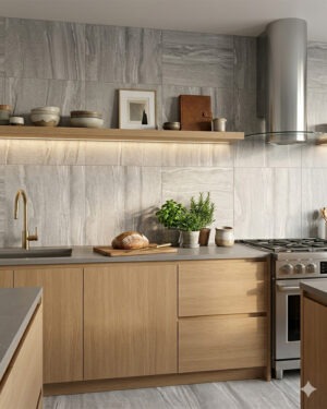 The d'Neapolis tile is a 200 x 400mm glazed ceramic wall tile with cushion edges and a soft grey stone-look finish. Ideal for bathrooms, kitchens, and feature walls, it offers a modern, low-maintenance solution for residential and light commercial interiors