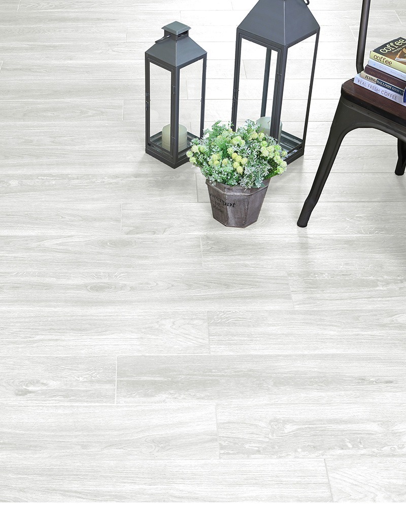 - Surface: Glazed wood-look finish in a light, modern white tone